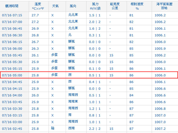 圖三: 7/16 am05:00 氣象局網站發佈的天氣資訊