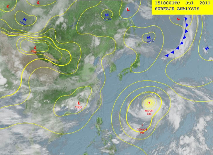 由圖一,圖二看到台灣西南部有一個低氣壓, 這低氣壓不強, 但很接近台灣, 它為台灣帶來多雲天氣, 台灣東部也有一個低氣壓, 這低氣壓很強(今年第6號颱風, 馬鞍颱風), 它吸走台灣東邊的雲系, 造成台灣東部能見度提高.